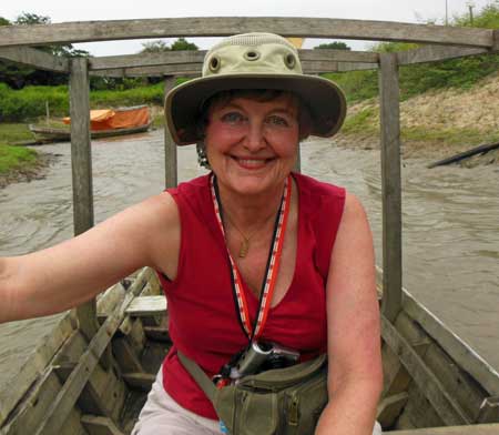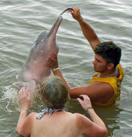 Karen swimming with the pink Dolphins in the Rio Negro, Brazil | Boating up the Valeria River, Brazil | ||